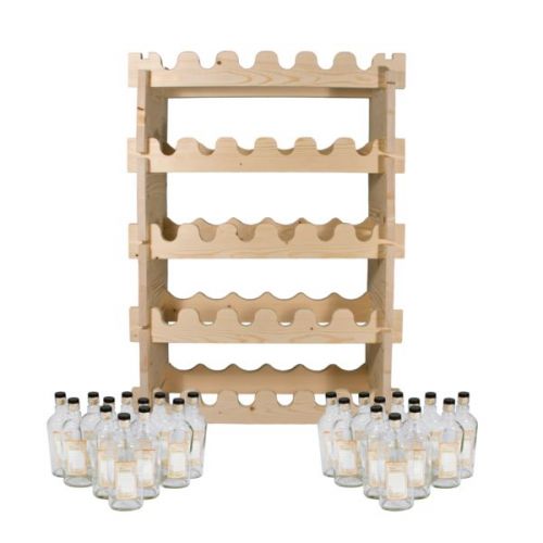 В комплект «Аляска» входит 24 бутылки из прозрачного толстого стекла и удобная деревянная полка под винные бутылки из соснового дерева. Долговечная сосна не потеряет прочность даже спустя много лет, а благодаря небольшому размеру полка не займет много места. Привлекательный внешний вид позволяет размещать ее не только в погребе или подвале, но даже на кухне, так как она способна вписаться в различные интерьеры. Каждая бутылка поставляется в комплекте с пробкой, которая надежно герметизирует содержимое. Помимо этого, в комплект входят наклейки, на которых можно подписывать содержимое тары.