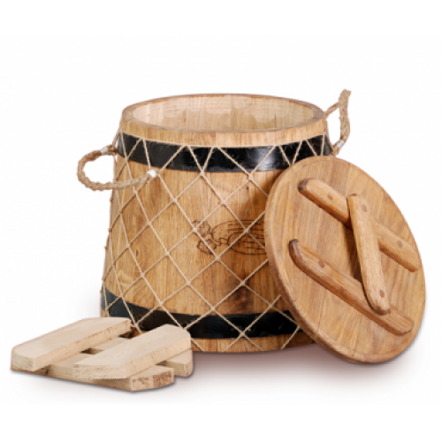 В наборе с кубельчиком, который имеет форму кадушки, вы приобретете еще и крышку для него, решетку для гнета и сплетенную вручную сетку, при помощи которой обеспечивается комфорт переноски этой емкости. При производстве кубельчика не применяют веществ с химическими компонентами, только натуральные материалы, а само дерево пропитывают пчелиным воском. Купить кубельчик дубовый 12 л (российский дуб) можно как для использования дома, так и в подарок вашим родным или знакомым.