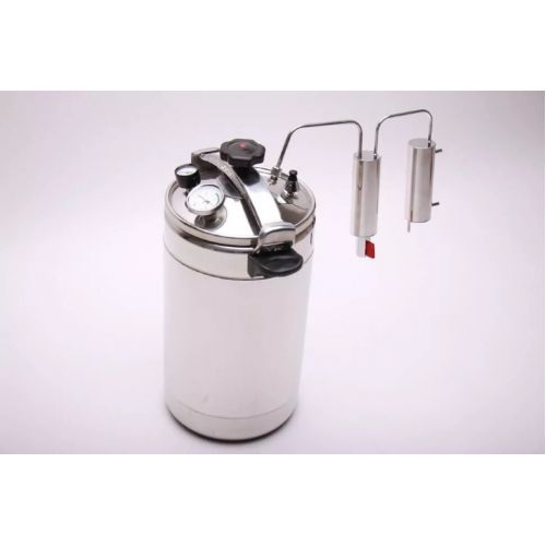 Аппарат сделан из высококачественной нержавеющей стали AISI 304, с толщиной стенок 2 мм и дна 3 мм. Металл автоклава способен выдерживать высокое давление, а сталь устойчива к коррозии и не прогорает. Сплав AISI 304 используется для пищевого производства, поэтому при создании самогона он останется чистым и без дополнительных привкусов. В комплектации идет приставка, которая позволяет использовать автоклав как дистиллятор, ведь с его помощью можно осуществлять приготовление различных алкогольных напитков.