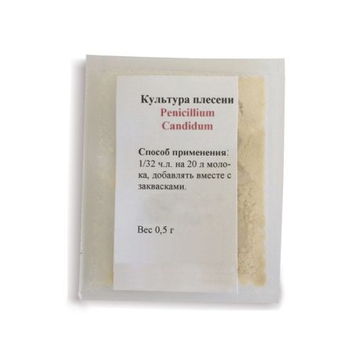 Penicillium Candidum – взращённая в лабораторных условиях чистейшая культура плесени, которая используется для домашнего изготовления благородных сыров. Она необходима для получения целого ряда сортов с белой плесению, среди которых популярные Бри и Камамбер. Применение культуры придает продукту пушистую плесень белого цвета, особый привкус и запах. Продукт должен храниться при температуре до -18 градусов. Нельзя держать культуру плесени в месте, где теплее 4 градусов.