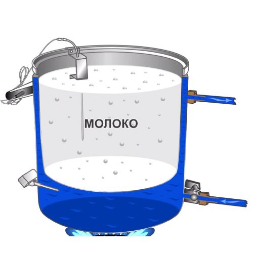 Одна из главных задач сыроварни – мягкое нагревание и охлаждение молока. С этой задачей сыроварня Bergmann справляется отлично! В ней есть рабочая чаша, в которой происходит пастеризация молока и его подготовка для сыроварения. В корпусе существует водное охлаждение и нагревание рабочей чашки, которое находится между стенками и рабочей емкостью. Емкость с водой очень герметична и избыточного давления в ней не бывает. Верхний штуцер отвечает за выпускание влаги, а на нижнем находится краник, который помогает регулировать поток.